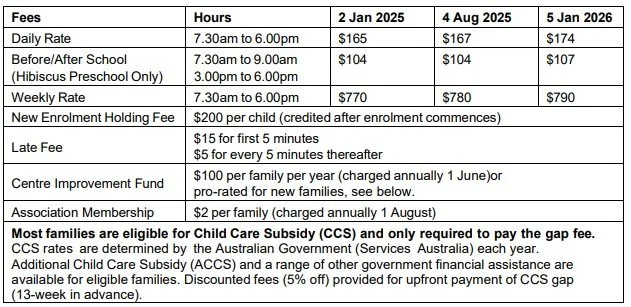 Child Care Subsidy: If it is your child's first time in an early learning centre, please apply for Child Care Subsidy (CCS) early to avoid paying full fees. How to apply for CCS.